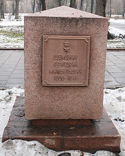 Алма-Ата , парк имени 28 гвардейцев-панфиловцев . Памятный камень, посвящённый Григорию Шемякину, родившемуся в 1906 (по старому стилю) или в 1907 (по новому стилю) году и фактически умершему в 1973 году, но на камне выгравирован год смерти как 1941, так как, по официальной версии, все 28 панфиловцев погибли.