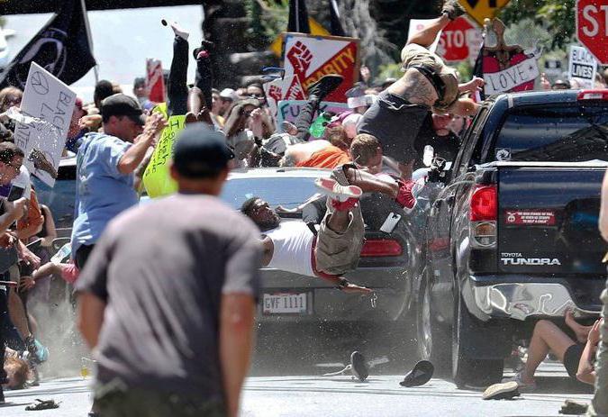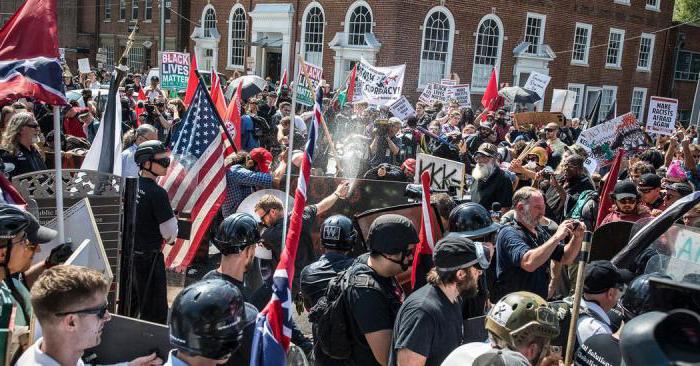 В Шарлотсвилле акцию протеста провели ультраправые сторонники Ku Klux Klan — с белыми колпаками на головах. У одного протестующего, но на затылке все написано: «День независимости США». Таким образом он демонстрировал всем флаг Конфедерации.