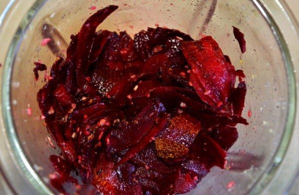 Измельчить и перемешать (можно в блендере) чеснок, воду, масло, соль, перец, травы. Поясню про воду и масло: после нескольких опытов мне понравилось соотношение 3:1. Если совсем не добавлять масло, чипсы получаются пересохшими, если добавить больше – на мой вкус, слишком жирными. Если не мариновать совсем и намазать «раствором» сверху, получается безвкусно, так как свекла не успевает пропитаться. Впрочем, все зависит от духовки и прочих условий, так что идеальные пропорции у каждого свои.