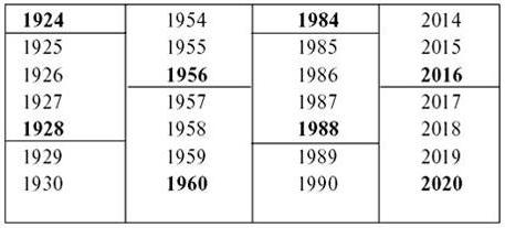 1904, 1908, 1912, 1916, 1920, 1924, 1928, 1932, 1936, 1940, 1944, 1948, 1952, 1956, 1960, 1964, 1968, 1972, 1976, 1980, 1984, 1988, 1992, 1996