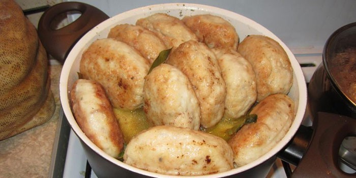 - Далее формируем котлеты, посыпаем мукой, сначала обжариваем по три минуты с каждой стороны на сковороде, потом тушим их десять минут в кастрюлю с водой.