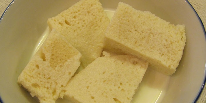 - Ломтики белого хлеба опускаем в воду или молоко.