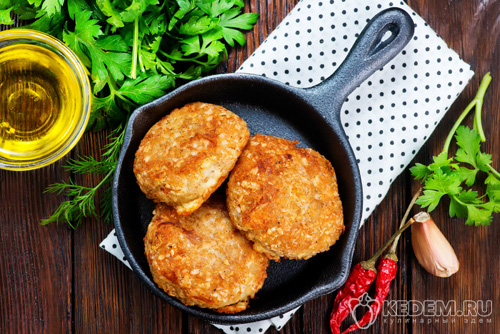- Из фарша делаем котлеты и поджариваем до румяного цвета, потом вливаем немного воды и пропариваем в течение 10 минут под крышкой.