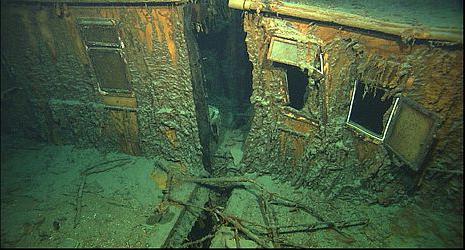 Зато надстройка с капитанской и офицерскими каютами и радиорубкой сохранилась хорошо, правда ее пересекает трещина, создавшаяся на месте деформационного шва. Видимая дыра в надстройке является местом расположения дымовой трубы. Еще одна дыра за надстройкой колодец, где размещена парадная лестница Титаника. Большое рваное отверстие, расположенное левее – место второй трубы.