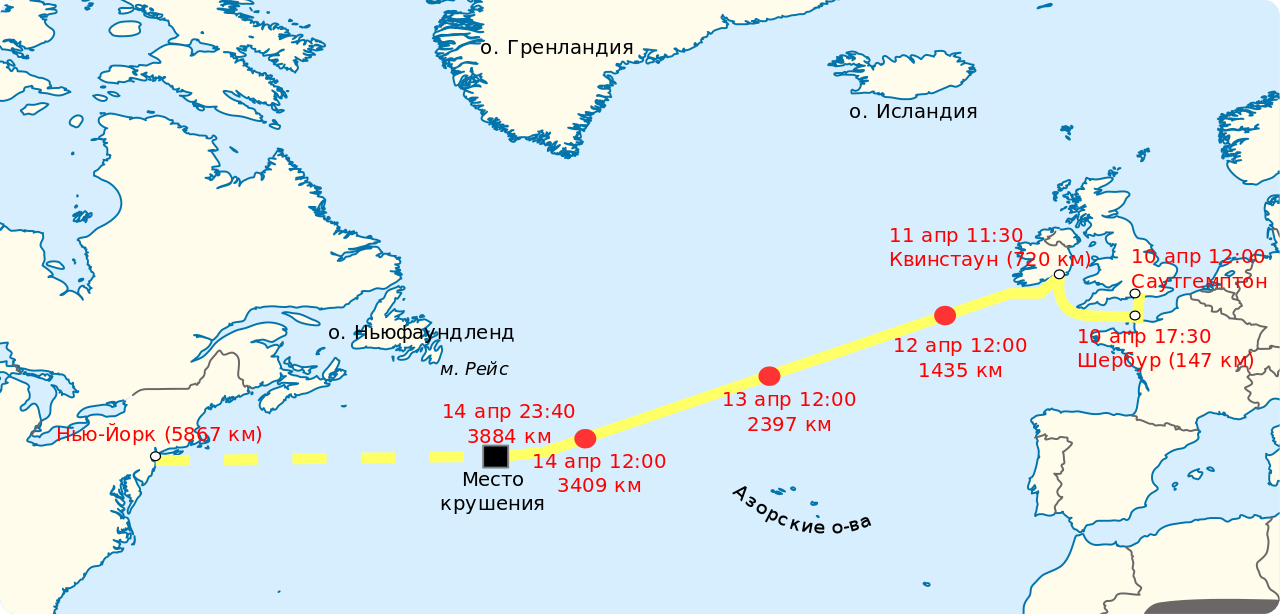 14 апреля 1912 года, пройдя в общей сложности 2689 километров атлантического пути, «Титаник» достиг точки вблизи Ньюфаундленда, где произошла его фатальная встреча с айсбергом.