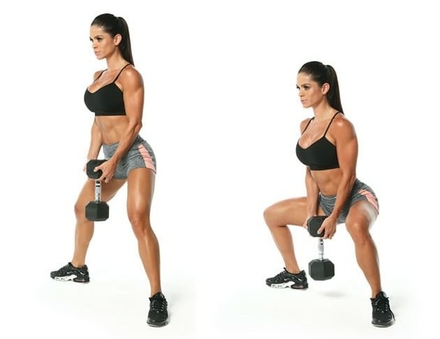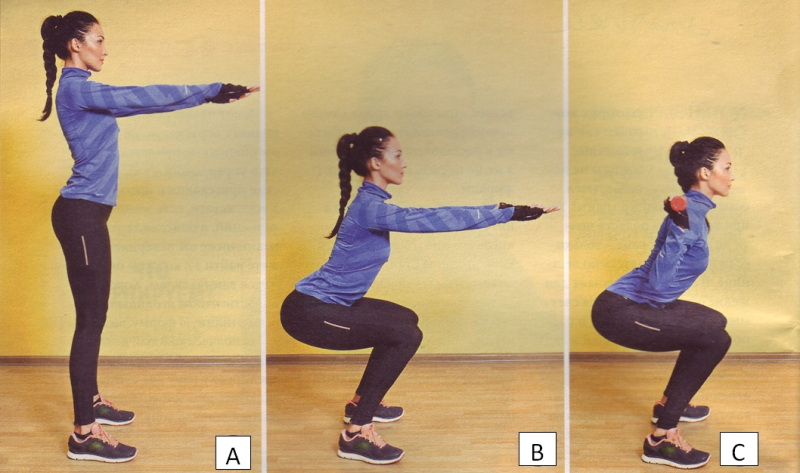 Встань прямо, ноги чуть шире плеч, руки вытянуты вперед параллельно полу, носки развернуты наружу. Напряги ягодичные мышцы.Не отрывая ступни от пола, присядь как можно ниже.Продержись в этом положении 2 секунды, затем вернись к исходной позиции. Сделав 20 приседаний, на последнем задержись в нижнем положении на 20 секунд, совершай короткие пульсирующие движения вверх-вниз.