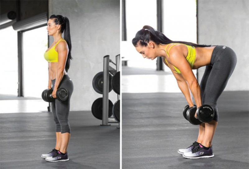 Встаньте и перекрестите ноги. Возьмите гантели и наклоняйтесь вперед, удерживая спину прямой. Потом поменяйте перекрест ног и повторяйте.