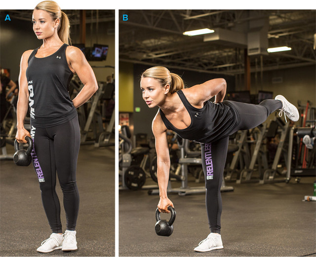 Встань в исходную позицию: ноги на ширине плеч, руки по сторонам тела. Слегка присядь, удерживая вес тела на пятках, затем подними прямую левую ногу точно назад, бедра при этом по-прежнему направлены вперед. Одновременно вытяни руки в стороны. Вернись в исходное положение, поменяй ноги.