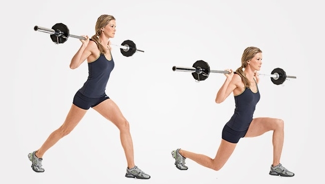 - Выпады со штангой, вес не должен быть для вас слишком тяжелым, если выполнять данное упражнение со штангой вам неудобно, возьмите по гантели в каждую руку,