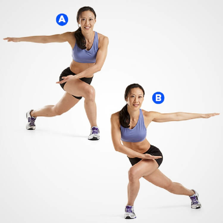 Встань прямо, ноги на ширине плеч, носки смотрят прямо. Приседай до того, момента, пока колени не окажутся согнуты под прямым углом. Сделай глубокий выпад назад левой ногой, правой рукой коснись пола или правого бедра. Левую руку подними вверх перед лицом, ладонь смотрит наружу. Вернись в исходную позицию и повтори все сначала, теперь выпад сделай правой ногой, а левой рукой коснись пола.