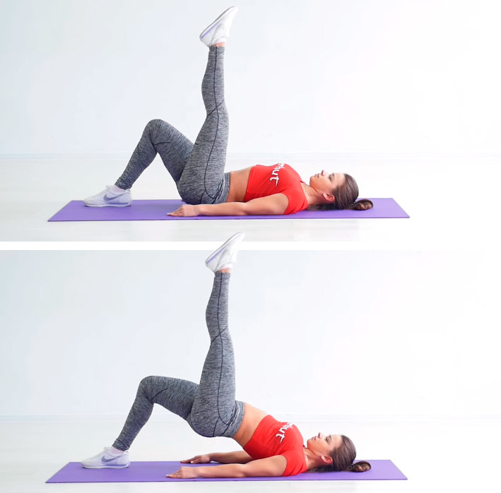 Лягте на спину, выпрямите одну ногу и согните другую. В этом положении поднимайте таз как можно выше, удерживая ноги в изначальном положении.