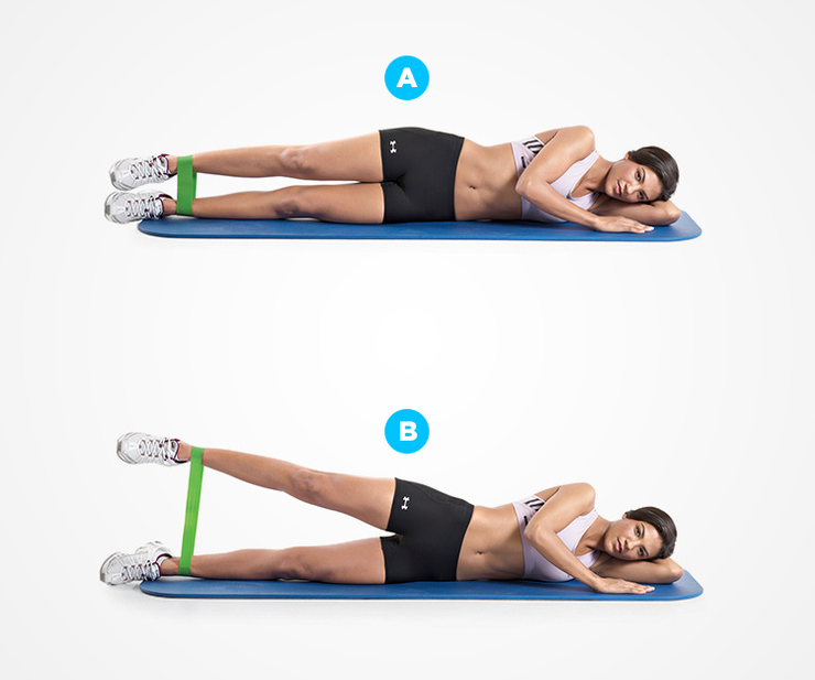 Упражнение помогает увеличить малые и средние ягодичные мышцы. Лягте на пол на боку, подоприте голову рукой. Сделав вдох, поднимите ногу от пола, оставляя колено выпрямленным. Нога должна составлять с телом угол не более 70 градусов. Сохраняя изометрическое усилие, удерживайте ногу, потом опускайте.