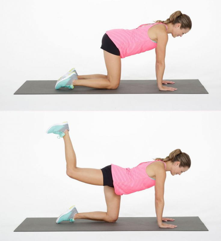 Махи на четвереньках — очень полезное упражнение. Просто встаньте на четвереньки и делайте махи назад, допустим, 50 одной и 50 другой ногой в день. Эффективным будет и выполнение упражнения «лесенкой: 3 подхода по 15, 12, 10 повторений. Для эффективности вы можете положить себе под колено гантель и поднимать ногу с ней — только не быстро, чтобы не уронить гантель. Не расслабляйте мышцы ягодиц.