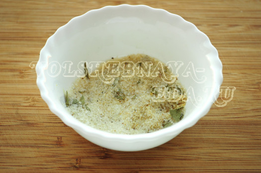Соедините в миске отмеренные соль, сахар, горчицу, кориандр и черный молотый перец, покрошите в них лавровый лист и перемешайте.