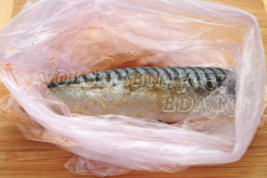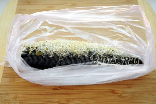 Потрясите пакет со скумбрией так, чтобы соль равномерно покрыла всю тушку рыбы и попала внутрь брюшка.