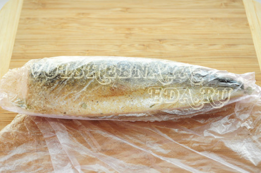Спустя 48 часов, достаньте скумбрию из холодильника и разверните.
