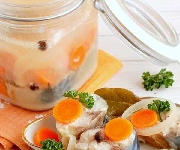 - Подготовленную тушку поместить в стеклянную тару, влить маринад, сверху уложить гнет и оставить на ночь. Утром гнет убрать, а рыбу переложить в холодное место на 72 часа.