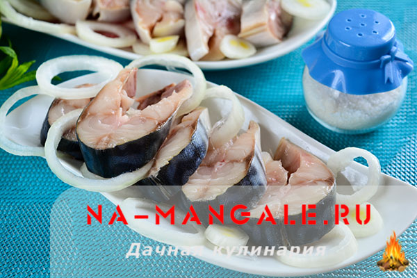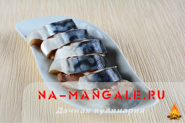 - Предварительно размороженную и выпотрошенную скумбрию (2 крупных рыбы), нарезать на кусочки, толщиной не более 2 см.