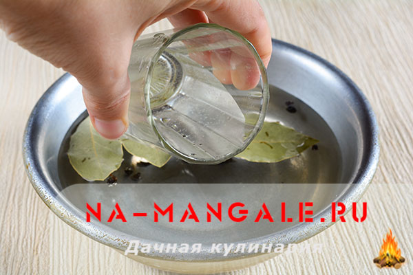 - Приготовьте маринад. В емкость с водой добавьте все специи, соль и сахар.
