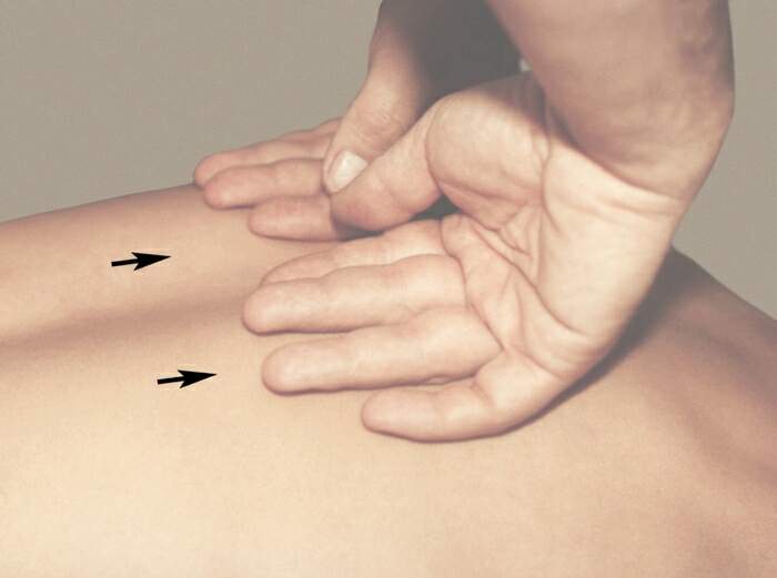 Нужно выполнить серию поглаживаний. Они осуществляются поперек позвоночника легкими поочередными движениями ладоней, далее можно сделать несколько движений ладонями вдоль позвоночного столба вверх и вниз. Рекомендуется выполнить и серию круговых движений.