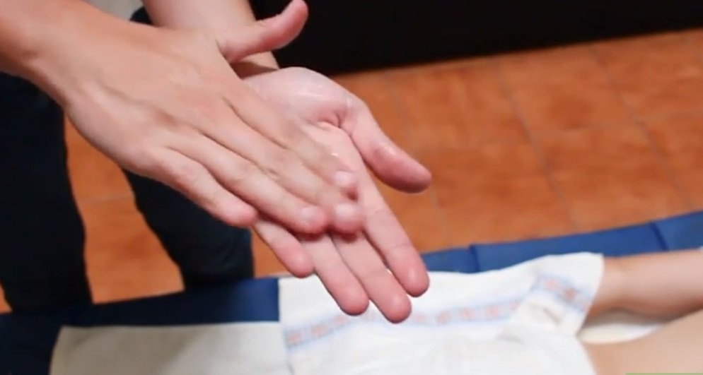 Пациент уже лежит на кушетке, которая застелена чистым полотенцем. Массажист предварительно вымыл руки. Далее ему требуется нанести немного массажного масла на руки и можно приступать к процедуре.