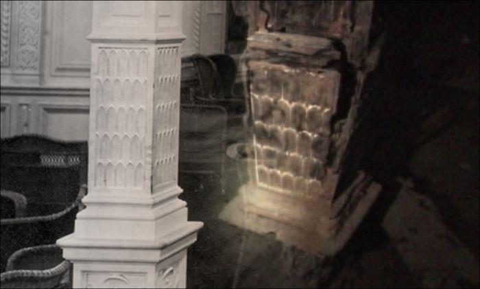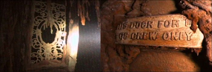 19. За лестницей размещалось несколько лифтов для пассажиров 1-го класса. От них сохранились отдельные элементы. Надпись, изображенная внизу справа, размещалась напротив лифтов и обозначала палубу. Это надпись принадлежала палубе А; бронзовая буква А уже отвалилась, но следы от нее остались.