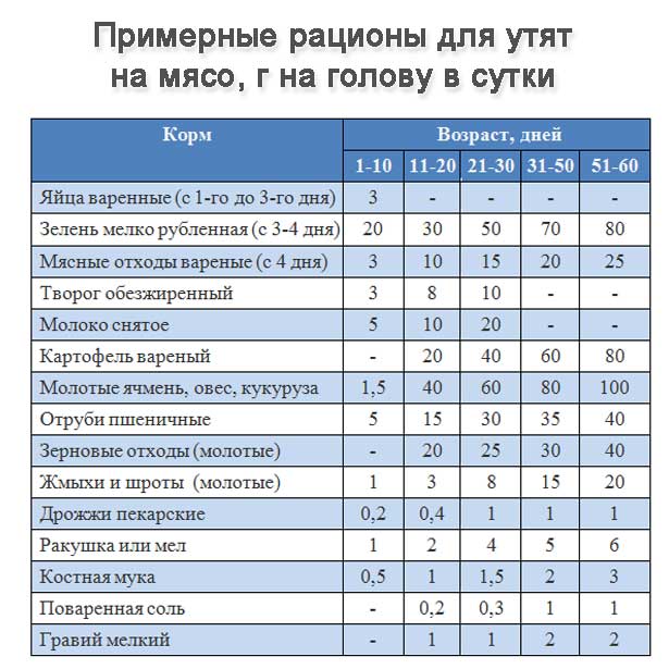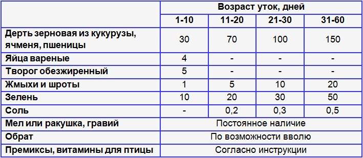 Примерные рационы для кормления уток разных возрастов из доступных в домашнем хозяйстве компонентов предложены в таблице ниже.