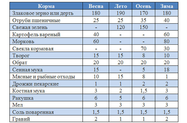 Таблица: Рацион и примерные нормы кормления уток несушек (г на голову в сутки):