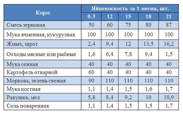 За три недели до запланированной яйцекладки (обычно – конец января) птицу переводят на другой рацион: увеличивают количество концентрированных и белковых кормов и уменьшают норму сочных и грубых кормов.