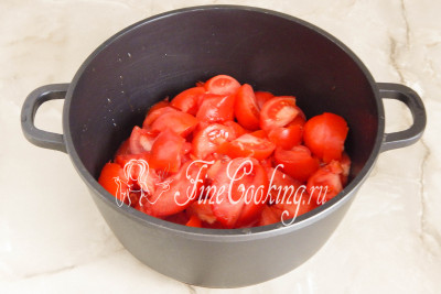 - Томаты вымываются и нарезаются на небольшие куски. Сорт томатов и уровень спелости не играют большой роли, главное, чтобы небыли чисто зелеными, иначе не будет приятного, красного цвета соуса.