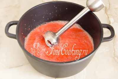 - Помидоры измельчаются до консистенции пюре любым удобным методом. Можно использовать блендер, мясорубку, терку.