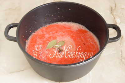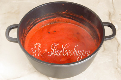 - В большую кастрюлю наливают томатное пюре, и доводят смесь до кипения.
