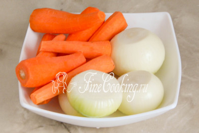 Тем временем займемся остальными овощами. Лук и морковь чистим — того и другого нам понадобится по 400 граммов в очищенном виде.