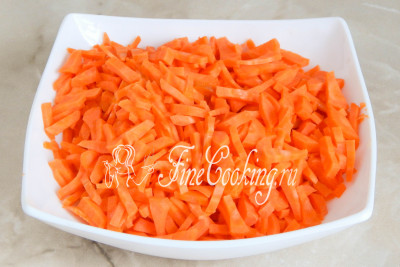 - Морковь очищаем и трем крупно (некоторые хозяйки здесь предпочитают порезку кольцами или полукольцами).