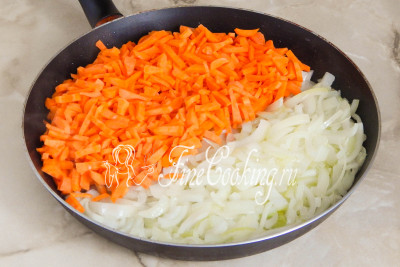 - В кастрюле разогревают растительное масло и добавляют лук. Когда он станет прозрачным, добавляется морковь.