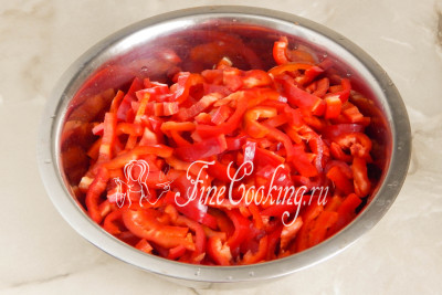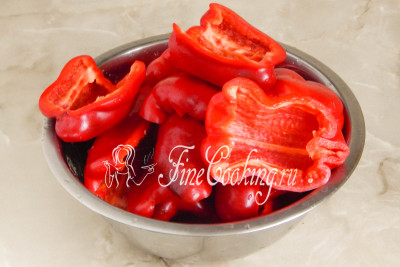 - Перец сладкий очищается от семян, хвостиков и режется полосками или любым другим образом – как нравится.
