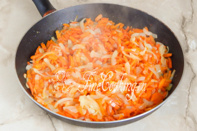 Когда лук будет наполовину готов и станет прозрачным, добавляем к нему морковь и жарим все вместе до полной готовности. Не забываем помешивать, чтобы не подгорело.