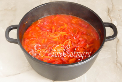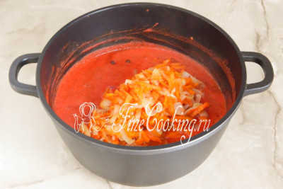 - Морковь и лук вводим в кастрюлю с томатной пастой и варим на очень слабом огне еще минут 15.