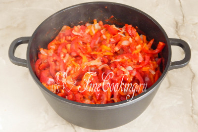 Готовность перца определяется по его текстуре: мякоть должна стать практически мягкой, при этом шкурка ни в коем случае не должна отходить (тогда вы уже просто переварили его). Но и хрустеть перец тоже не должен — найдите золотую середину лично для себя. Морковь и лук до этого были уже почти готовы, поэтому с ними все понятно.
