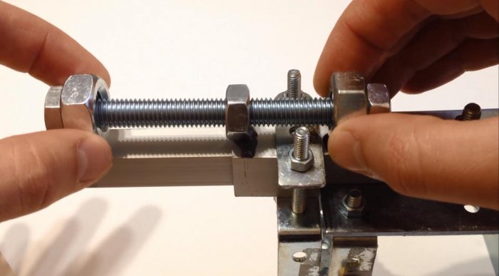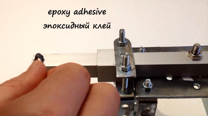 Для настройки отступа рамки от смотрового стекла используем болт М8х100 мм. Нам понадобится две гайки под размер болта, и две большего размера. Берем эпоксидный клей, и в трех местах приклеиваем гайки болта к штативу. Закрученную на конец болта гайку также можно зафиксировать эпоксидкой.