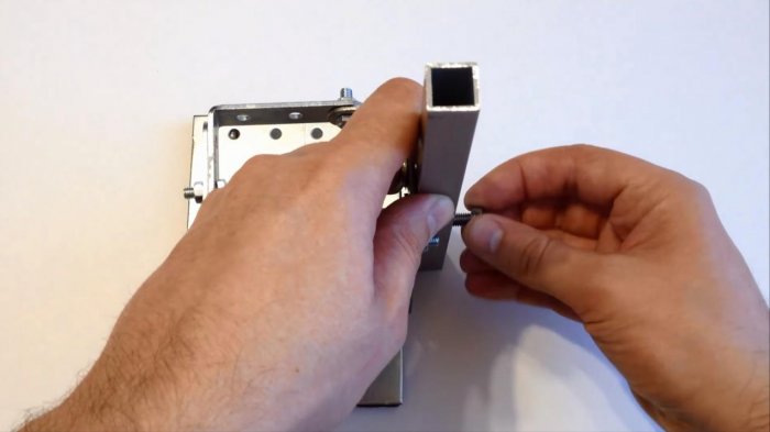 Из двух кронштейнов, совмещенных между собой внахлест, делаем открытую рамку. Болты выбираем подлиннее, чтобы их хватило на поджим этой рамки вокруг подвижного отрезка трубы. Насаживаем на них пластину с двумя отверстиями по бокам, и гайками фиксируем ее.