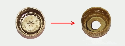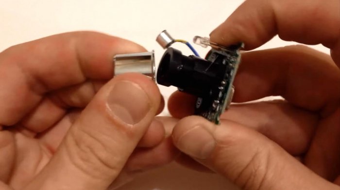 - Подготовка. Разбираем камеру, оставляем пиксельную матрицу. Оптику снимаем. Вместо нее на этом месте фиксируем бронзовую втулку. Она должна совпадать по размеру с новой оптикой, можно выточить из трубки на токарном станке.