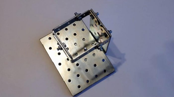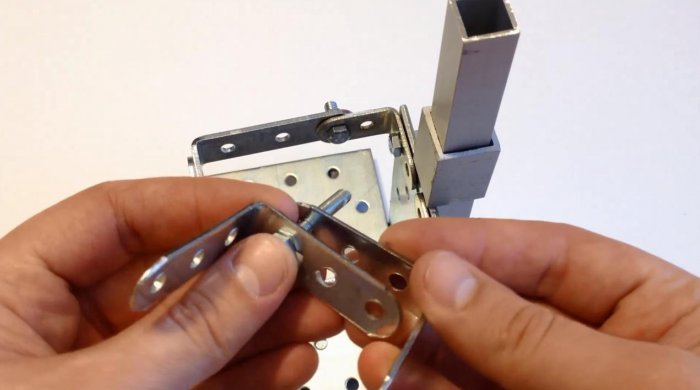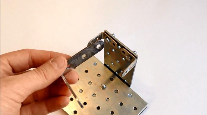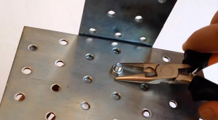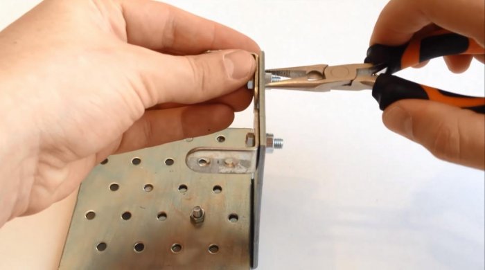 Следующим элементом будет кронштейн или уголок с разносторонними полками. Скрепляем короткую полку кронштейна и пластину-основание болтом с гайкой. Подтягиваем их плоскогубцами для надежности.