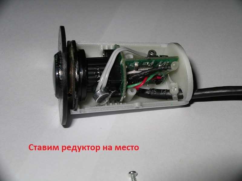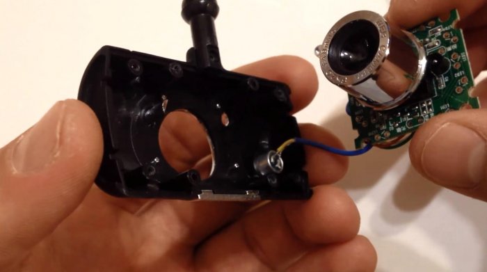 Далее необходимо снять переднюю панель камеры, чтобы добраться до настройки фокуса. Для этого надо сдернуть декоративную панельку, а затем выкрутить пару винтиков и снять основную пластиковую панель, за которой находится нехитрая начинка.