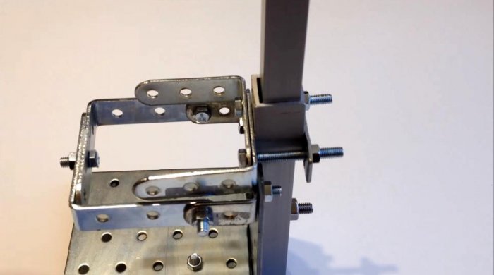 Штатив крепим к перфорированному кронштейну, а поверх него насаживаем небольшой отрезок трубы 20х20 таким образом, чтобы он свободно двигался по этой стойке.
