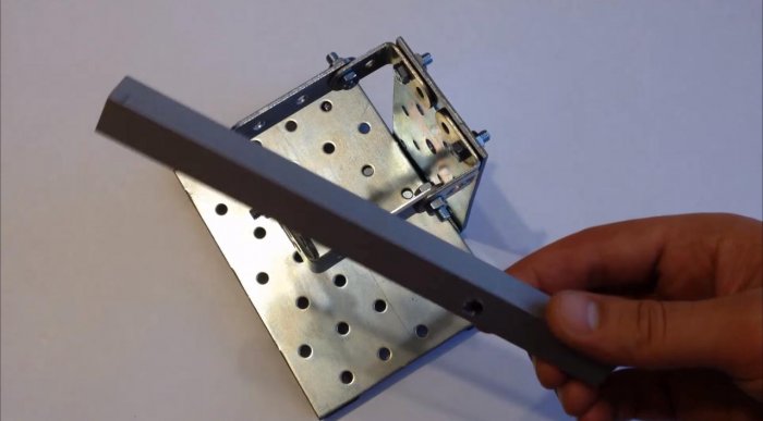 Для штативной основы микроскопа используем перфорированные пластины и уголки из металла. Их используют для соединения деревянных изделий. Они легко скрепляются болтами, а множество отверстий позволяет это сделать на требуемом уровне.