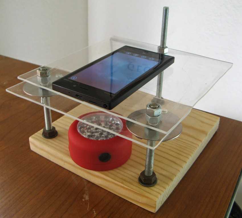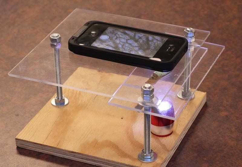 Превратить смартфон в микроскоп очень просто: надо наложить маленькую линзу на объектив фотокамеры. Линзу можно вынуть из старого CD-привода или из лазерной указки, купленной в ближайшем киоске. Но когда вы закрепите линзу на смартфоне. то столкнётесь с одной проблемой: ровно удерживать смартфон на небольшом расстоянии от объекта съёмкиочень сложно из-за маленькой глубины резкости. Вот тут и надо начинать делать специальный стол.