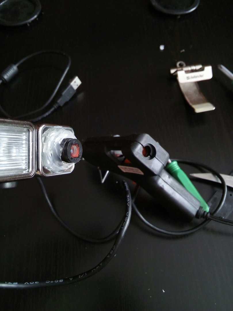 Теперь осталось зафиксировать результат, для этого можно воспользоваться клеевым пистолетом. Здесь же рекомендую подклеить стяжку или другой гибкий кусочек пластика в качестве фиксаторов, это необходимо для того, чтобы зафиксировать окуляр, чтобы изображение у вас не вертелось, вслед за проводом веб-камеры, можно даже несколько таких стяжек, ну или еще как придумаете. Пролить вокруг клеем и дать застынуть.