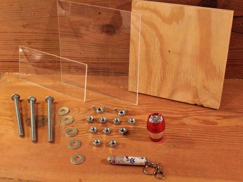 Два мелких кронштейна монтируем на край пластины по обеим ее сторонам. К ним прикрепляем еще два уголка подлиннее так, чтобы у нас образовалась небольшая рамка. Это будет основание для смотрового стекла микроскопа. Его можно сделать из небольшого отрезка тонкого стекла.