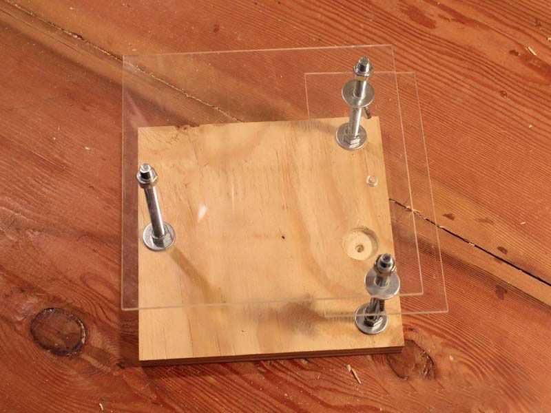 Основание стола сделано из обрезка доски толщиной 20 мм. По углам просверлены отверстия под болты диаметром 8 мм. Оргстекло толщиной 3 мм добыл на работе -позаимствовал канцелярскую подставку. Из неё вырезал крышку для стола, на которой будет
